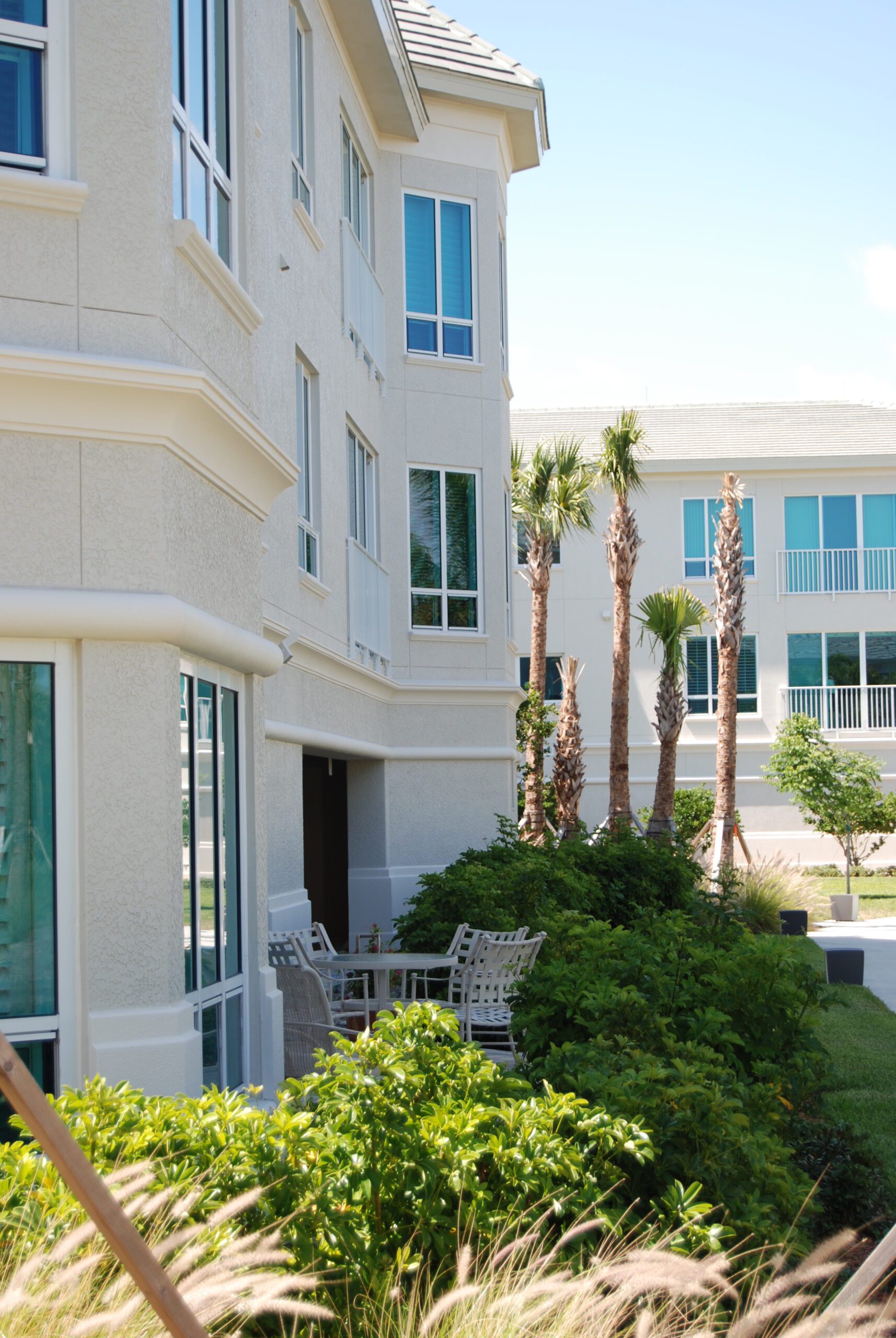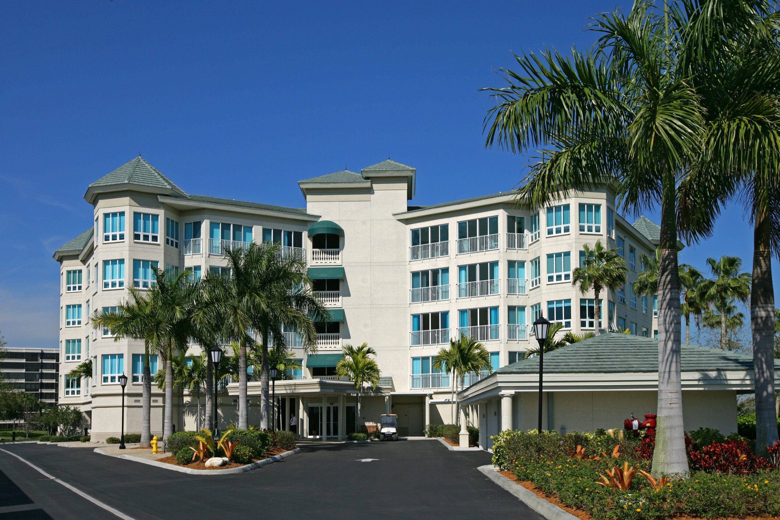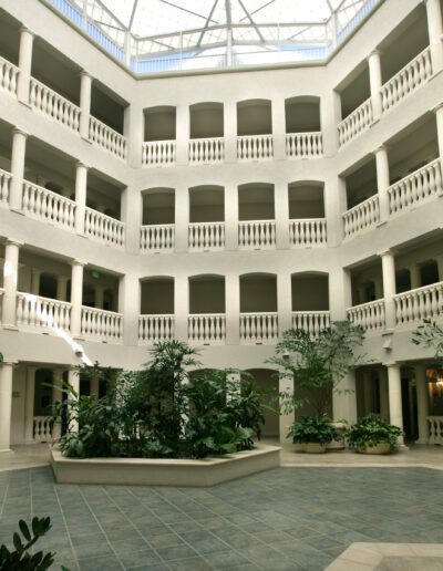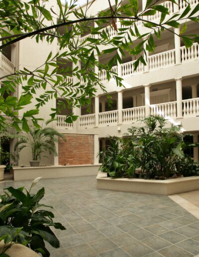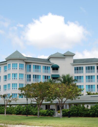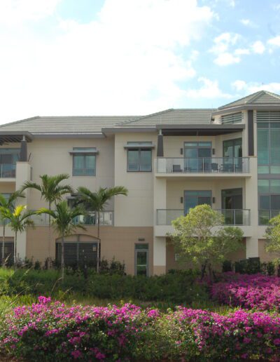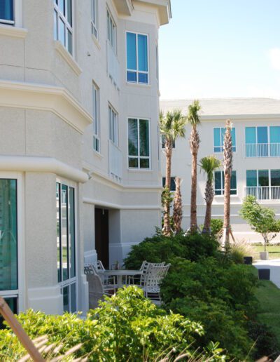 J and K Towers provide fifty-four independent living apartment units. The four-story central courtyard encourages interaction among residents, as does the front porch area at the entrance to each unit. Covered parking for each unit is available on grade beneath the building. The glazing is hurricane-resistant, and each building is equipped with a backup generator.