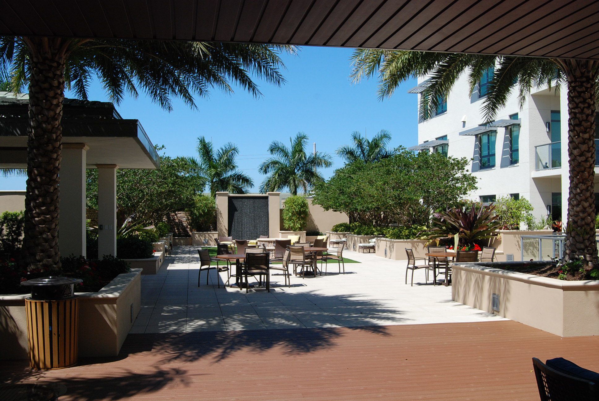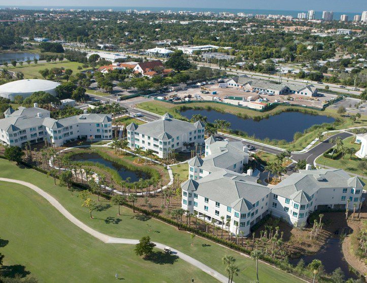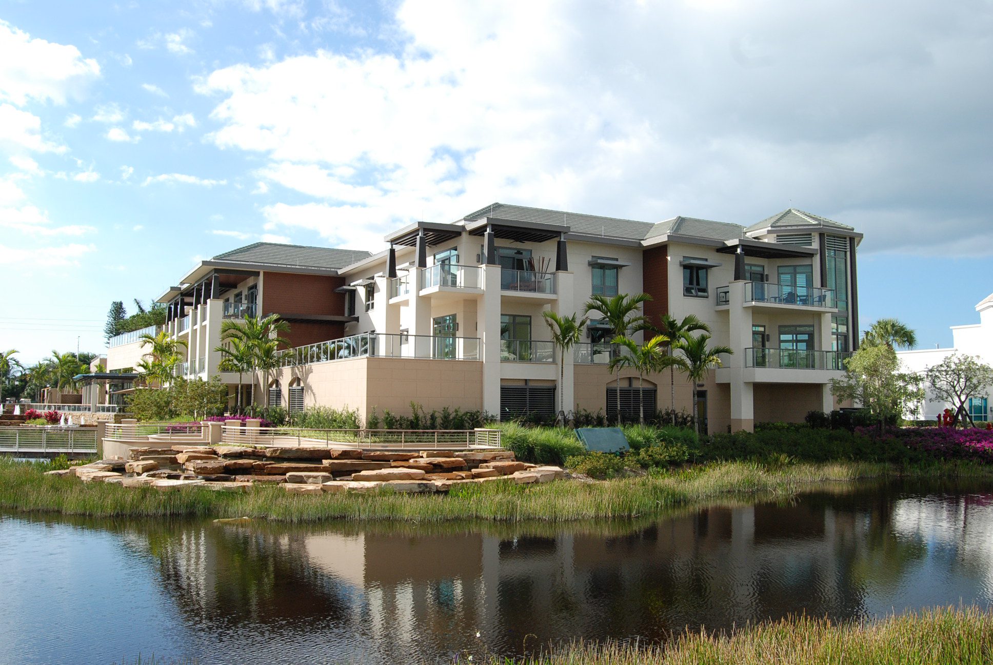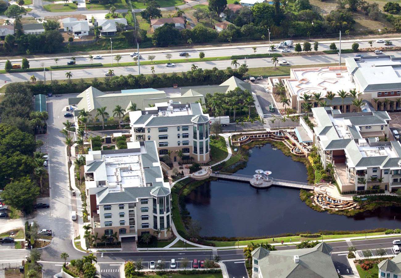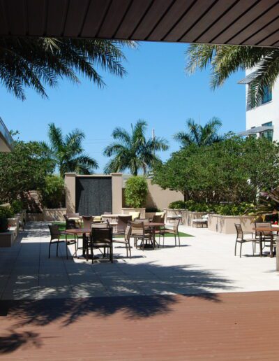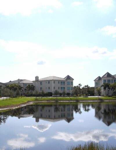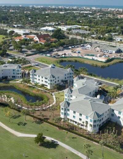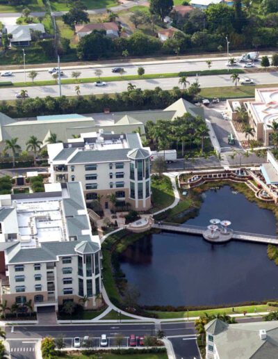 Buildings O, P, and Q provide luxurious independent living apartments that range in size from 1,850 up to 5,500 square feet. The two five-story buildings, O and P, are joined at the second floor with a roof garden that has an infinity-edge pool, water walls, and a fire pit all surrounded by a lush garden. Most units are entered directly from an elevator, providing security as well as privacy and convenience. Building Q also includes a 7,000-square foot restaurant that caters to a wide range of dining palates and includes a full bar and chef’s table. An outdoor patio offers dining next to the waterfalls of the stormwater lake. The lake has a bridge with seating in the center overlooking a lit planter of flowering bougainvillea, a romantic and beautiful feature for the residents.