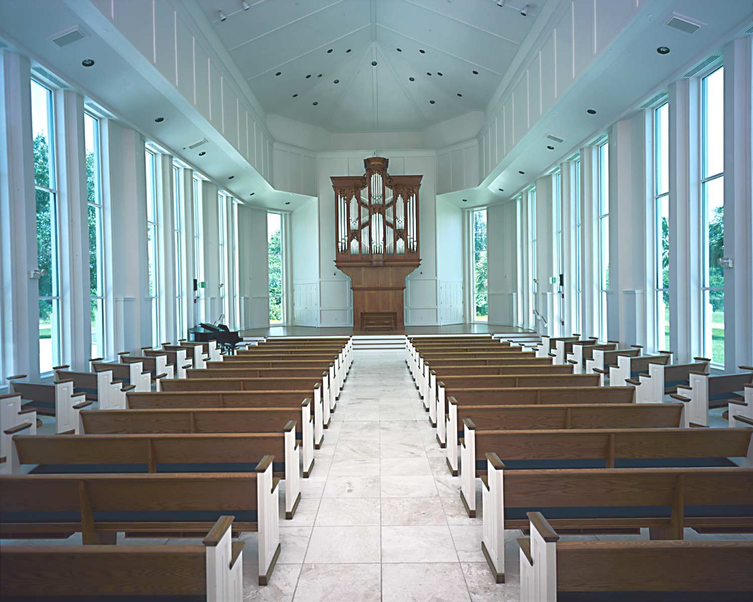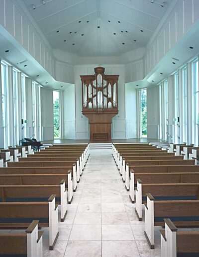 Bower Chapel, originally completed in 2000, is a nondenominational facility located within the Moorings Park retirement community. The traditional design responds to the owner’s request for a “timeless” concept, with a seating capacity for 132 in pews and with expanded side aisles for overflow seating. The chapel was designed to the acoustic requirements of the “tracker” type organ with a three-second reverberation time. In 2019 Burt Hill/Pollock Krieg Architects was invited back to provide design services for a “green room” addition. A seamless addition to the original building, the area functions both as a waiting room for visiting speakers and musicians and as a family mourning room during funeral services.